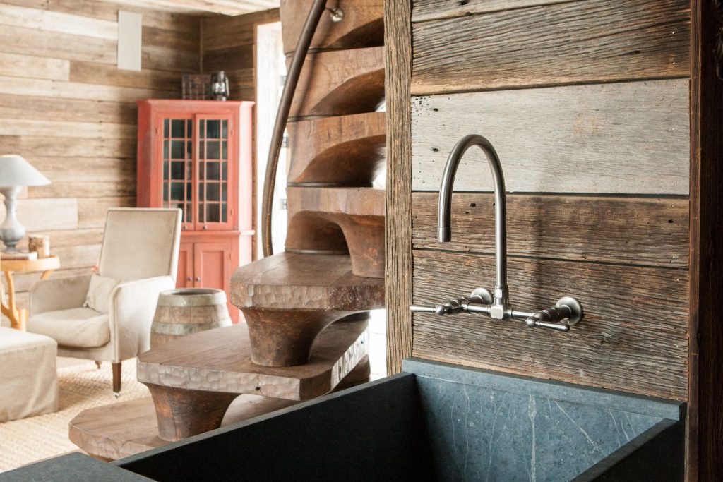 Kennebunkport Staircase A spiral stair provides access to a sleeping loft in a small, multi-purpose barn that blends rustic charm with refined design. This artfully crafted staircase complements the barn’s aesthetic while maximizing functionality.