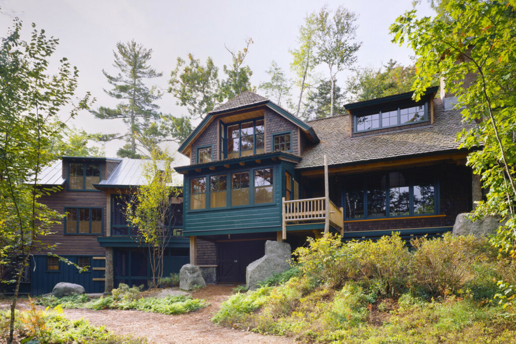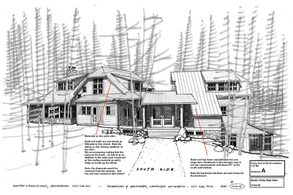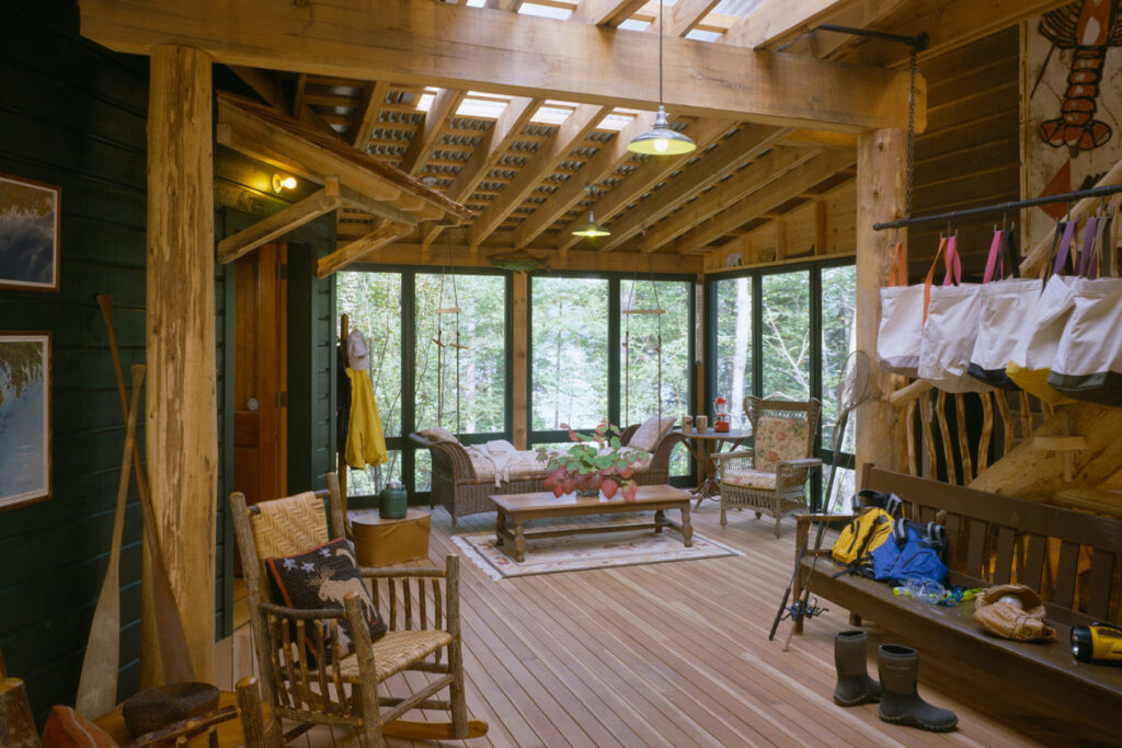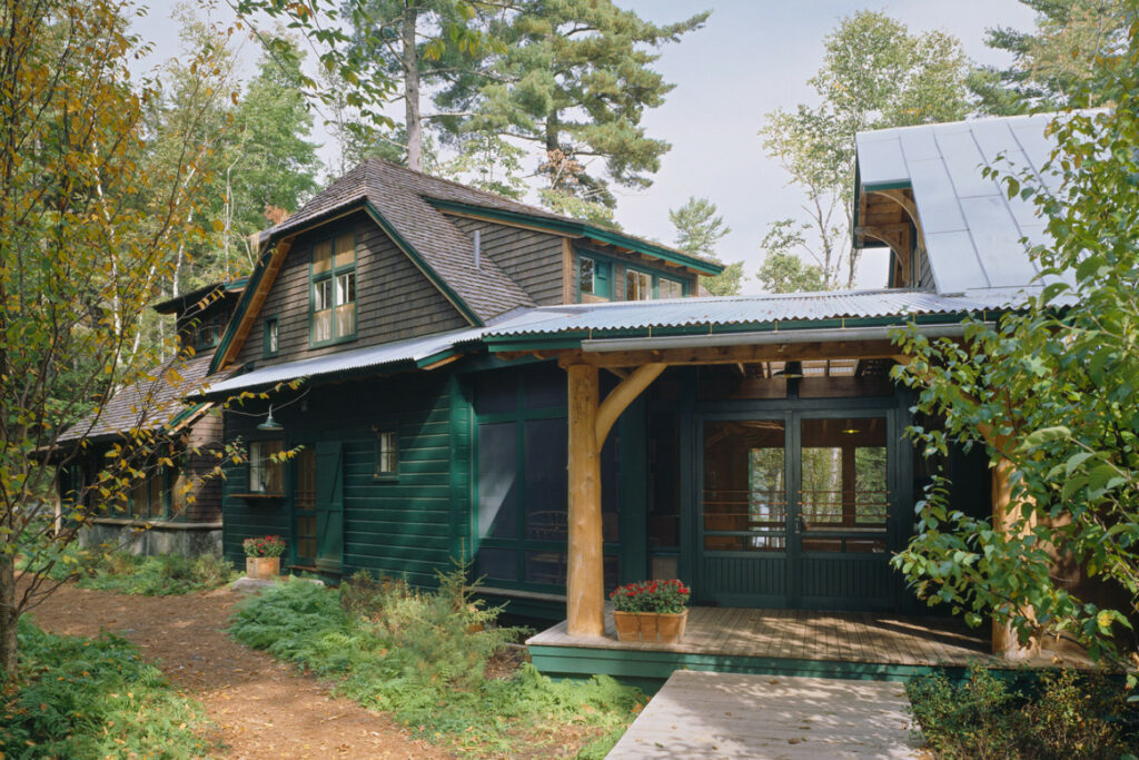 A Traditional, 3-season camp for a couple with 4 children; 2 additional families visit frequently AND need to be accommodated (approximately 20 people total). The clients wanted a camp with a deep woods “feel” that fit into the site as if it has been in place for generations. Daylighting was important, and the camp needed to be easily secured for coming and going and seasonal protection.