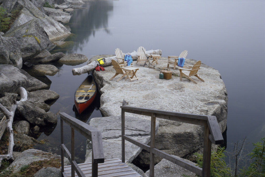 The design harmoniously integrates a rugged lakeside site with massive boulders and cliffs, creating a flexible camp that accommodates 20 guests, maintains a “deep woods” feel, and minimizes visual impact through thoughtful architectural solutions.