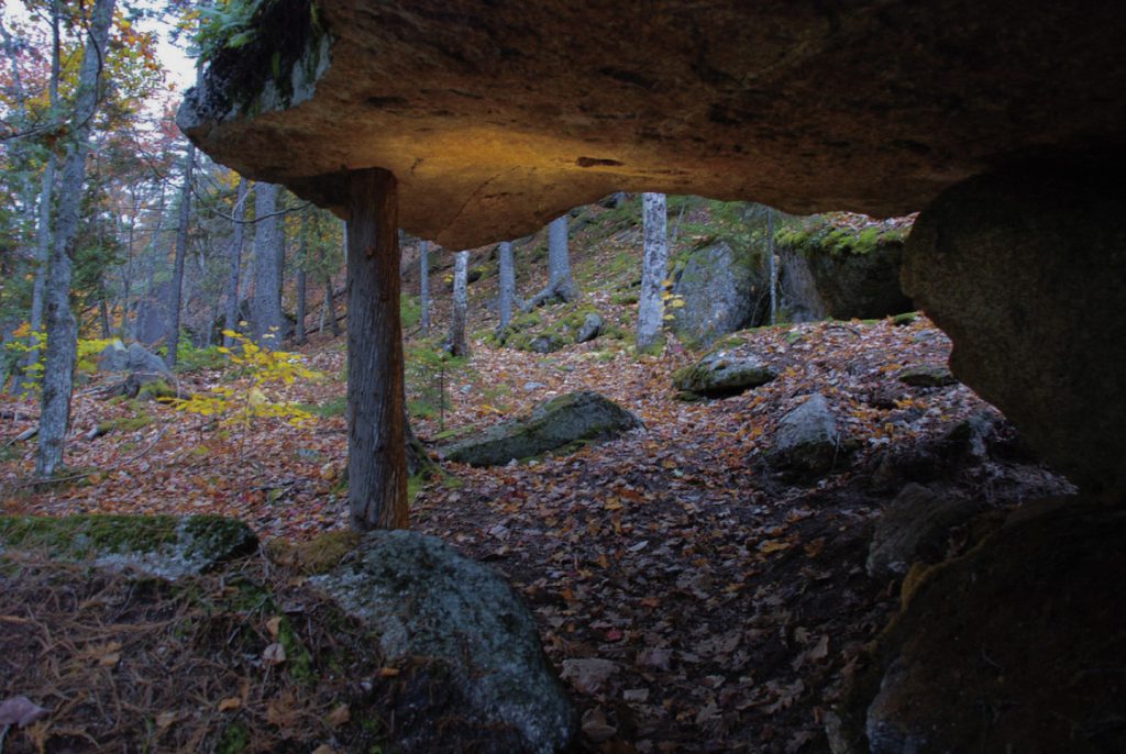 A heavily wooded lakeside site, with north-facing views and dramatic adjacent cliffs strewn all about the site, is massive, weathered boulders, the size of cars and trucks.