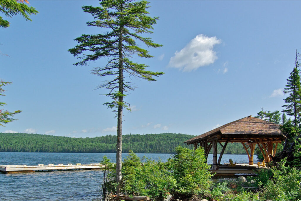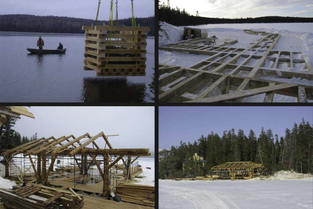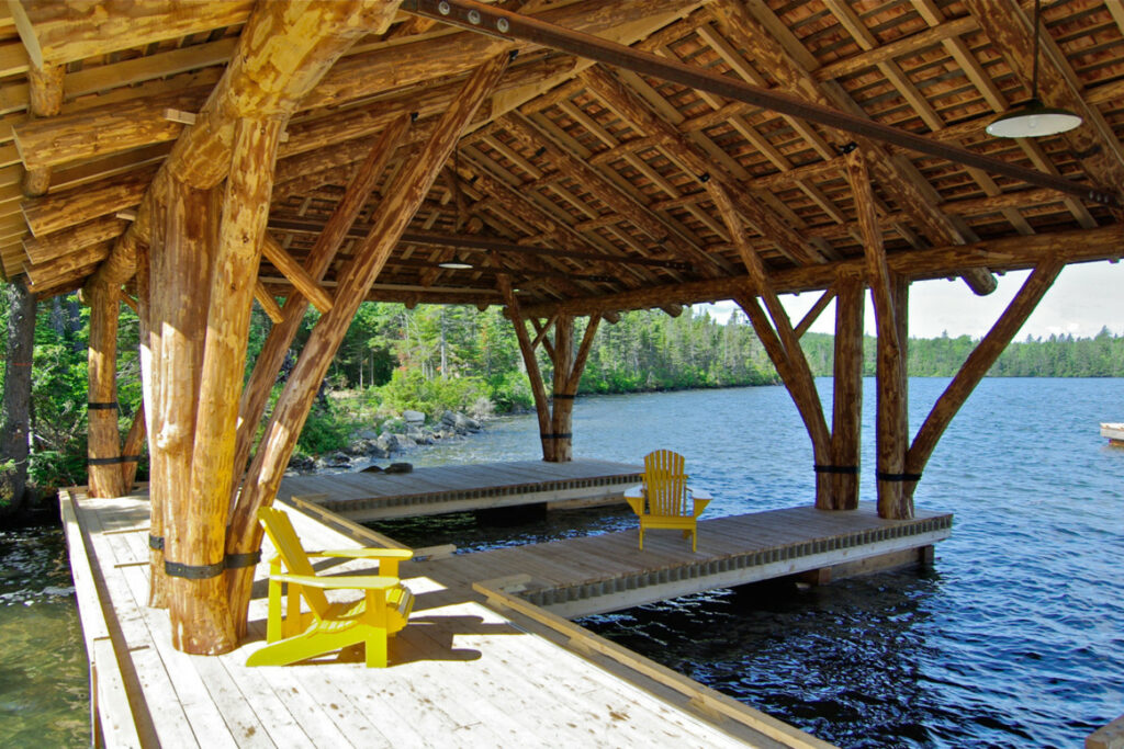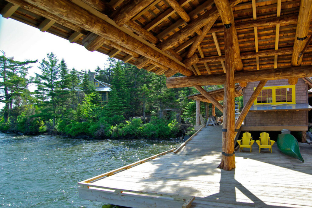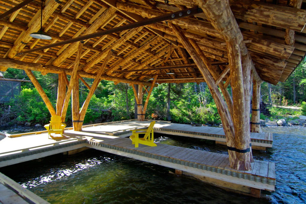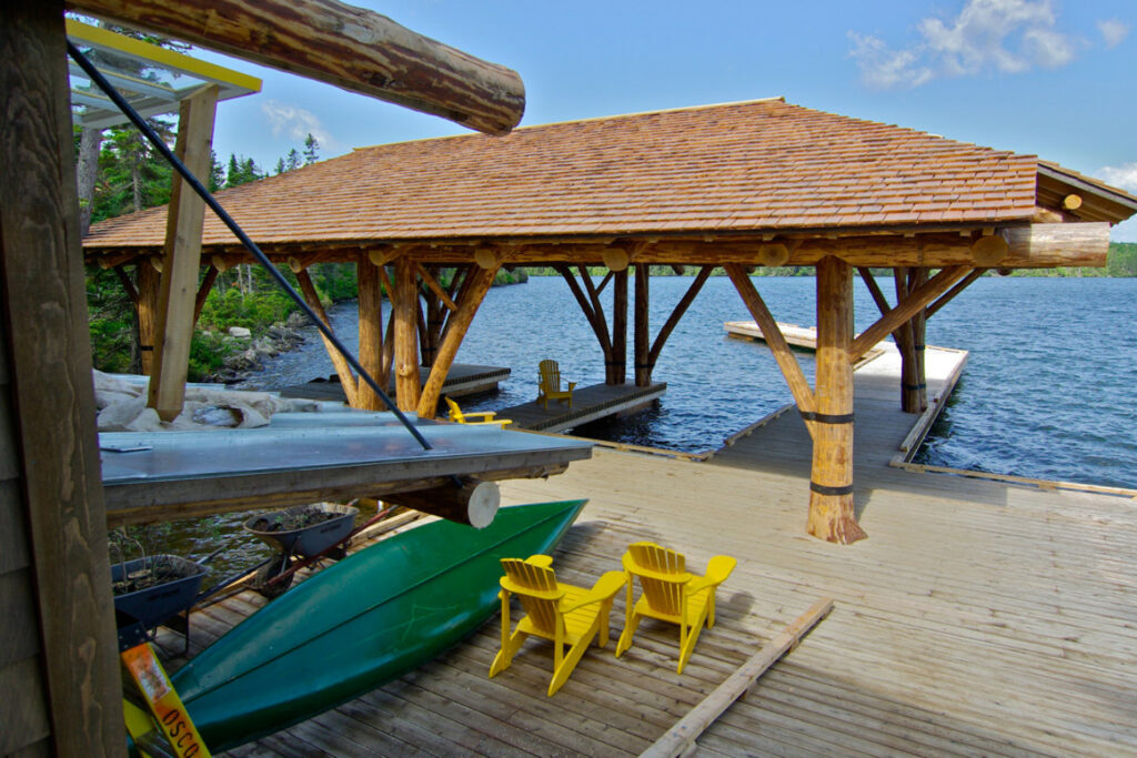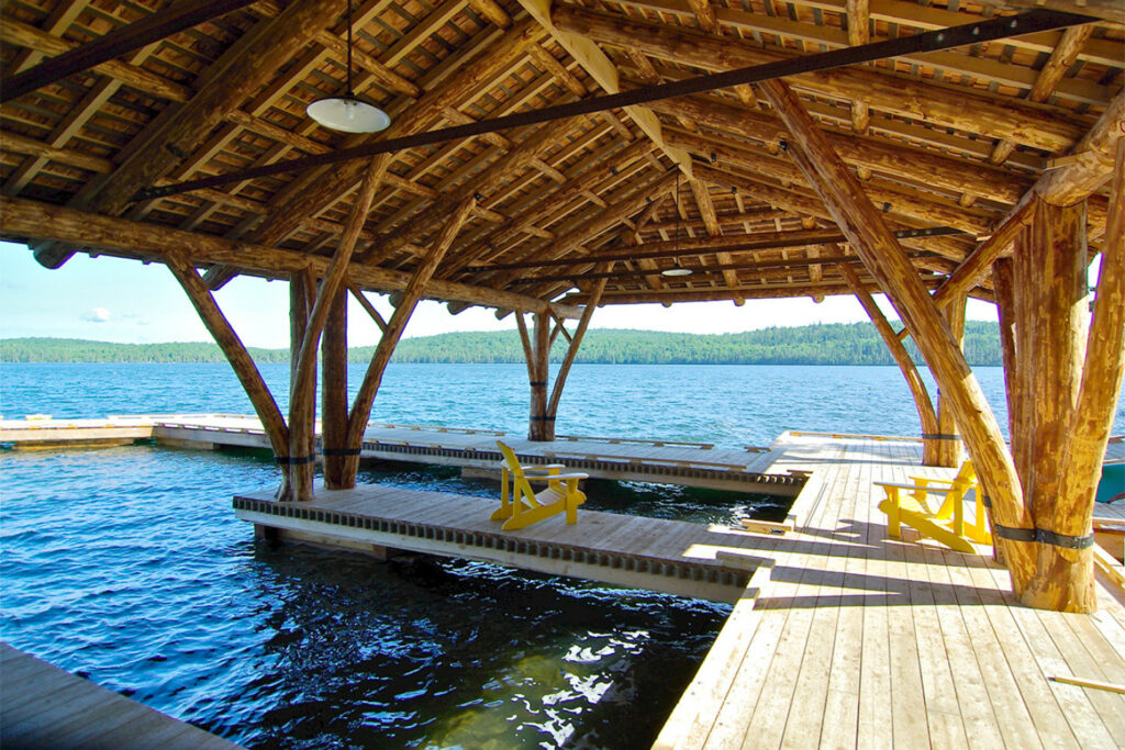 In order to blend in with the rustic nature of the other structures of the camp, the boathouse was constructed entirely out of locally harvested logs and rough-sawn timbers. The support posts were fitted and assembled in a very tailored but organic fashion, and wrapped in rugged, hand-forged steel bands.