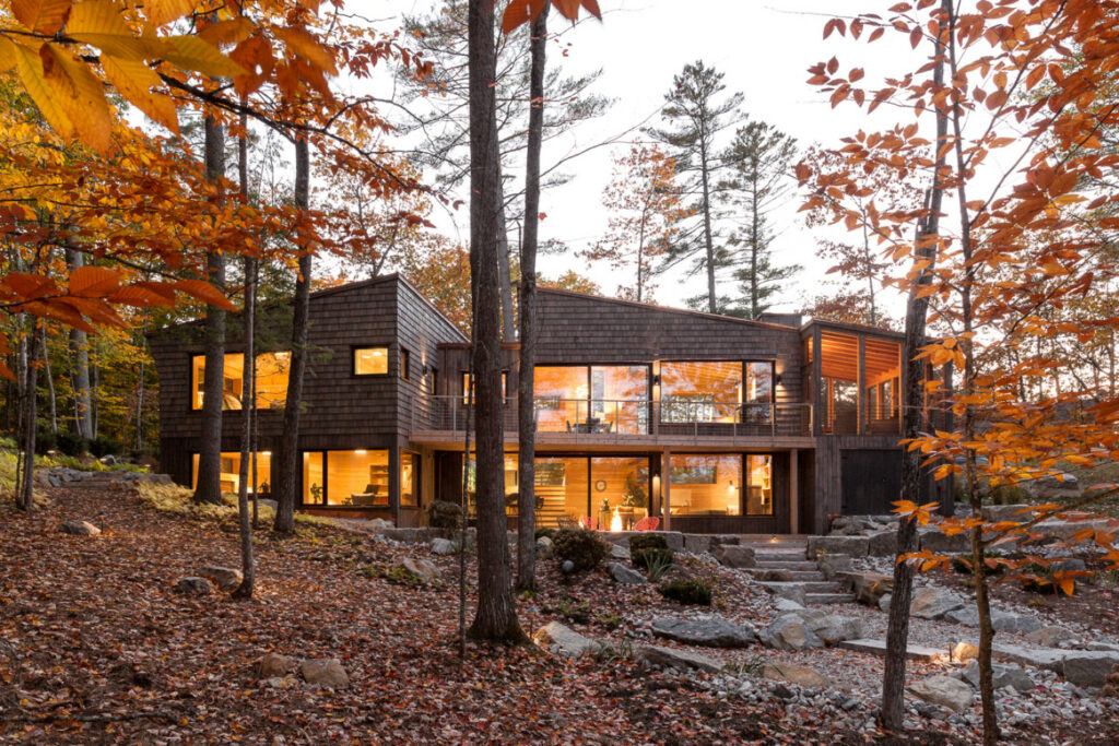 Enormous glass doors and windows frame the views of the woods and water and allow for easy access to the deck and the ground-level patio and lake below.
