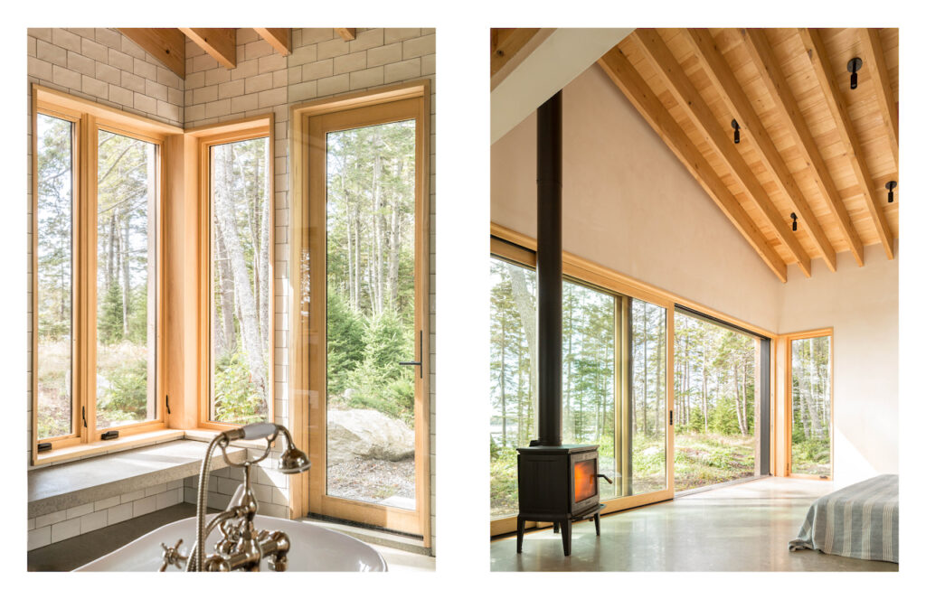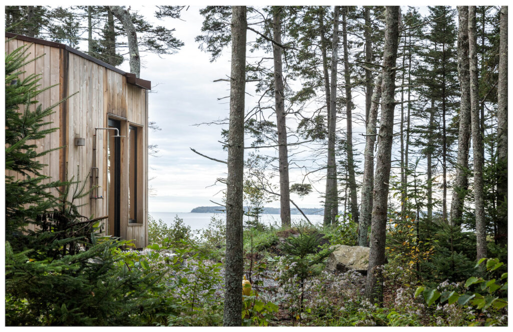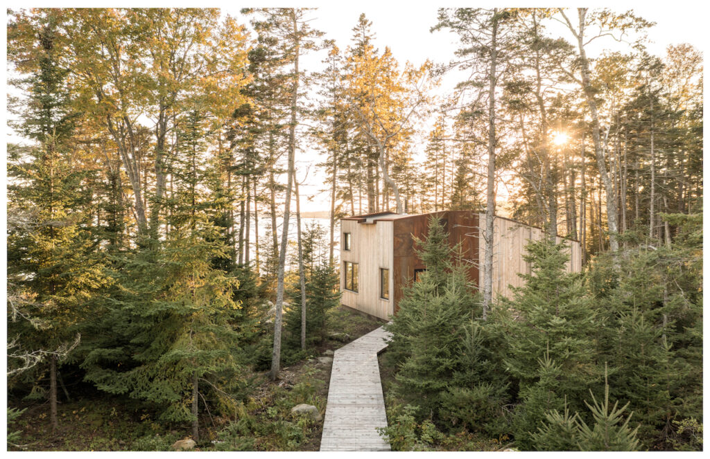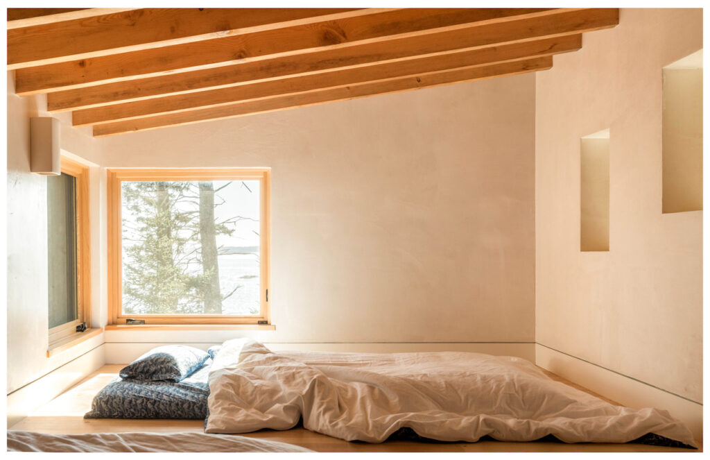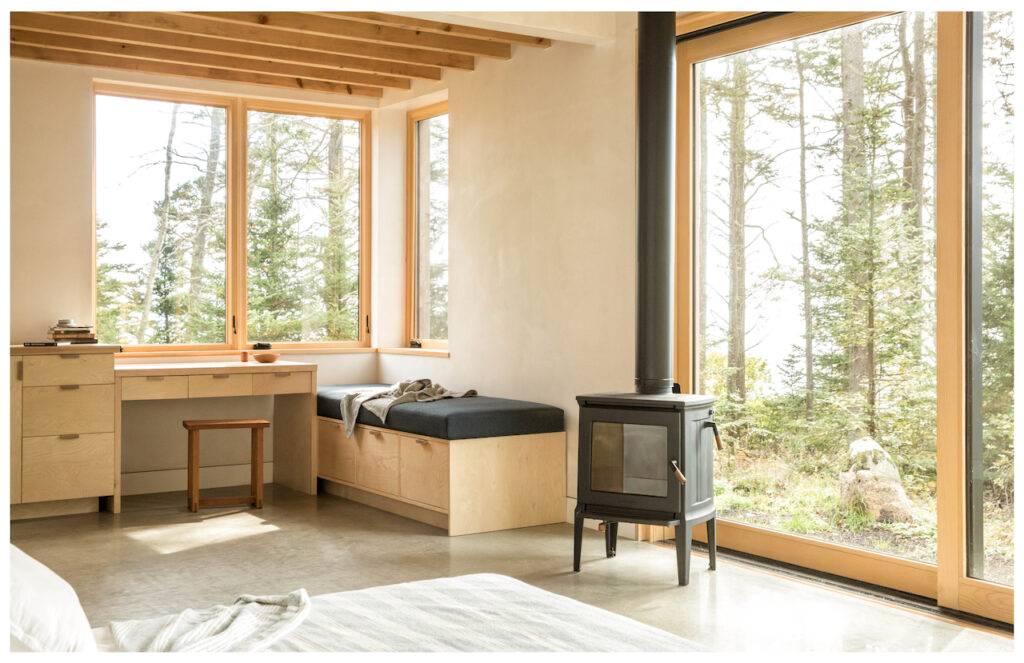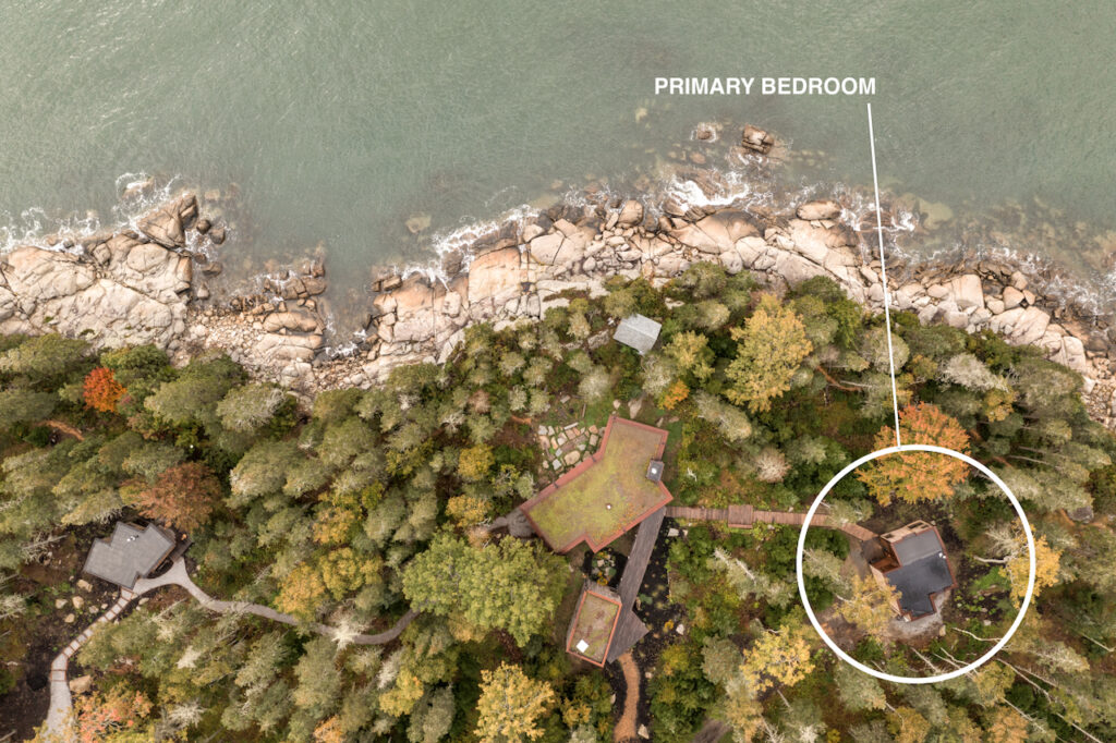 The principal bedroom suite at Otter Pt, completed in 2020, is a serene retreat connected to the main social hub by a boardwalk. This design takes advantage of the site's multiple building locations, offering extraordinary views and a strong connection to nature.