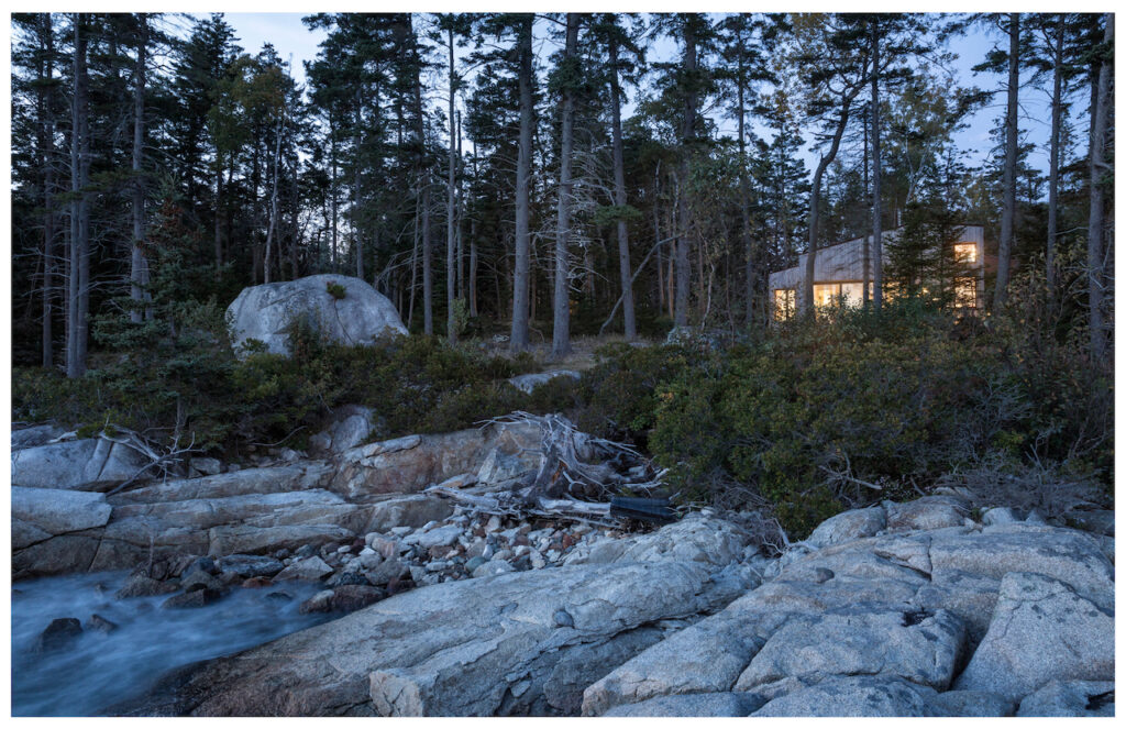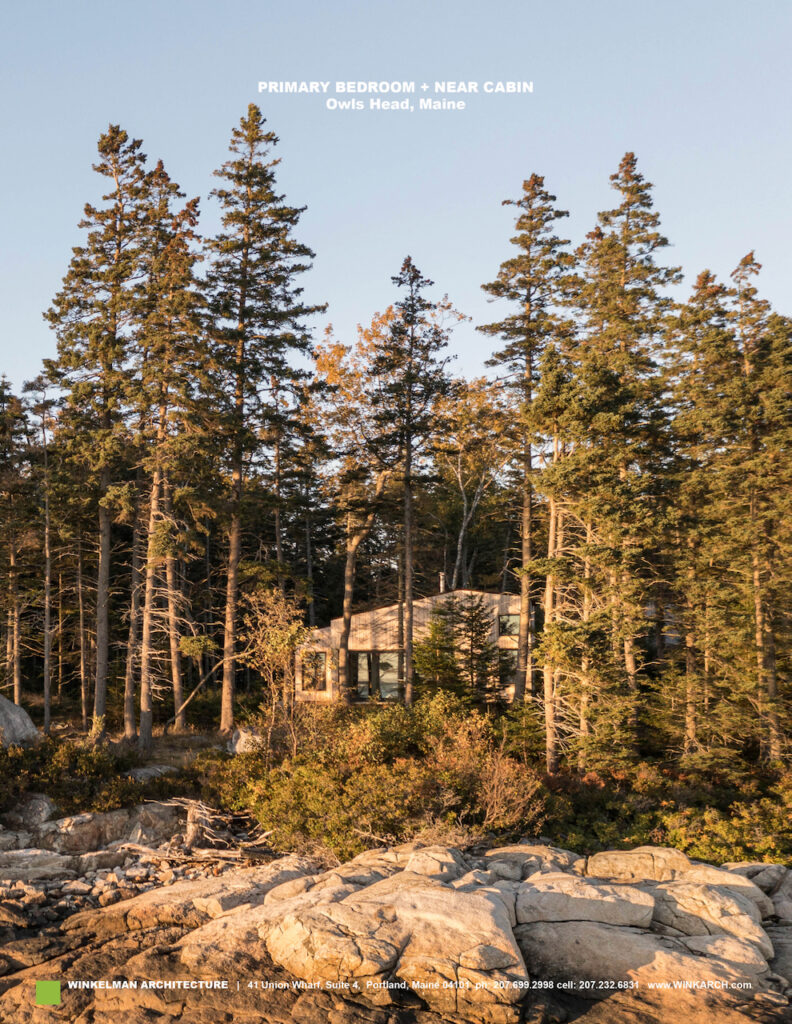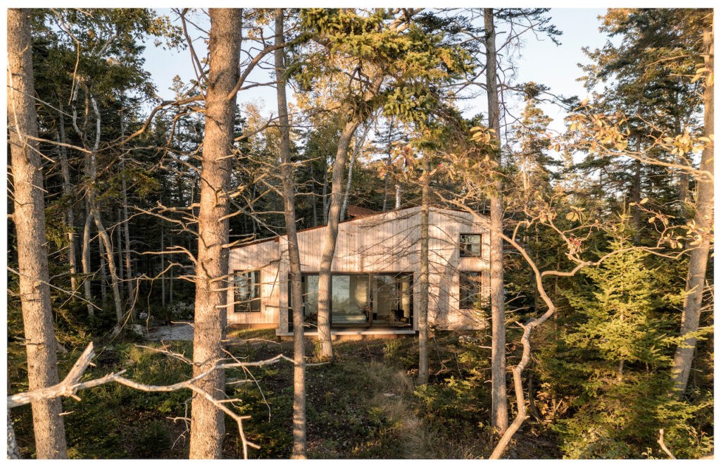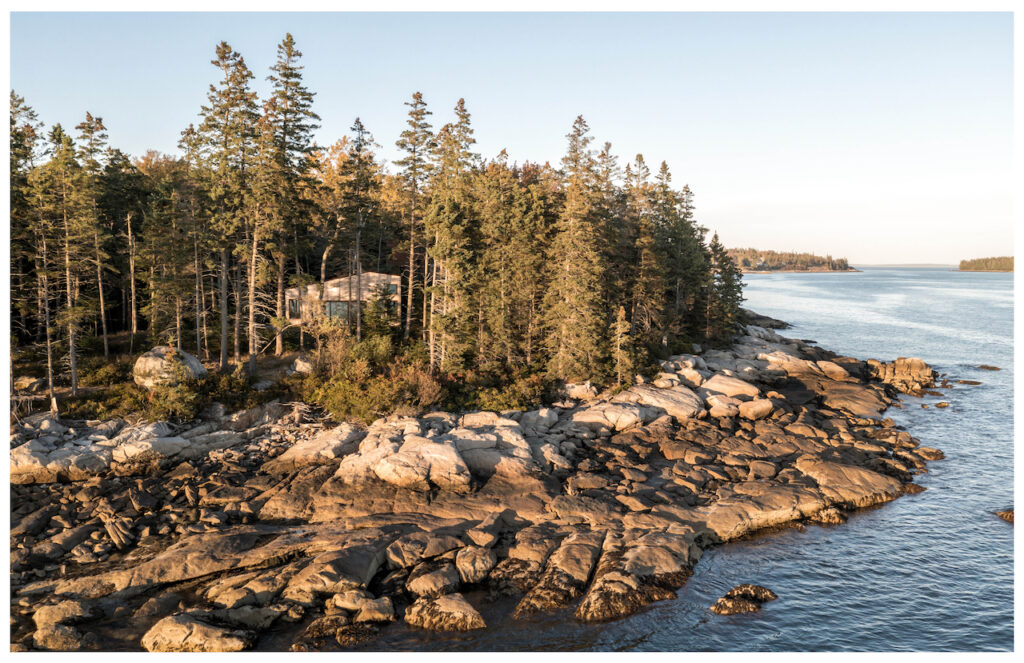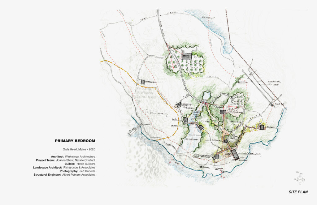 The principal bedroom suite at Otter Pt, completed in 2020, is a serene retreat connected to the main social hub by a boardwalk. This design takes advantage of the site's multiple building locations, offering extraordinary views and a strong connection to nature.