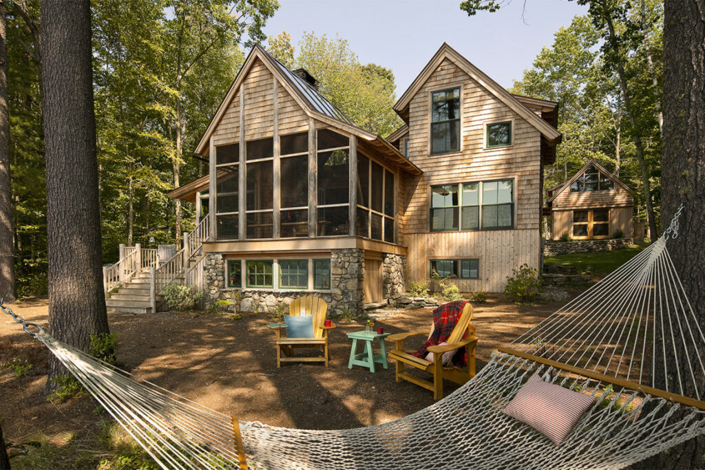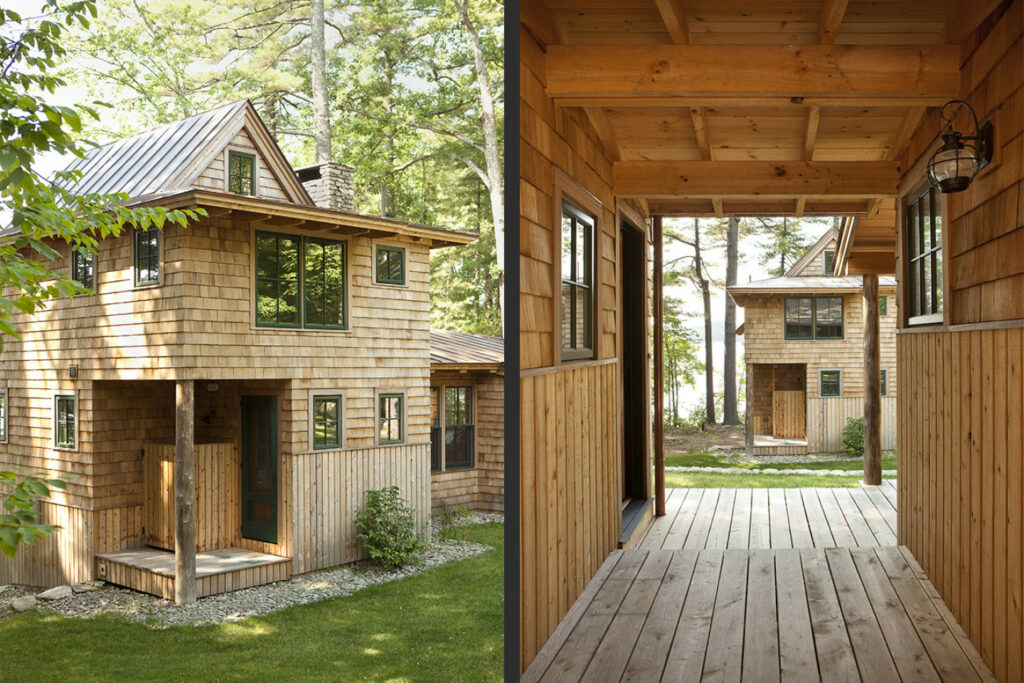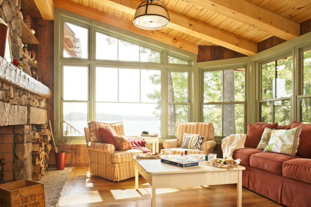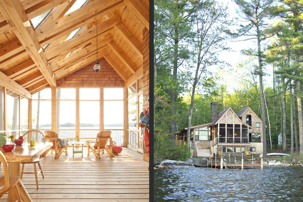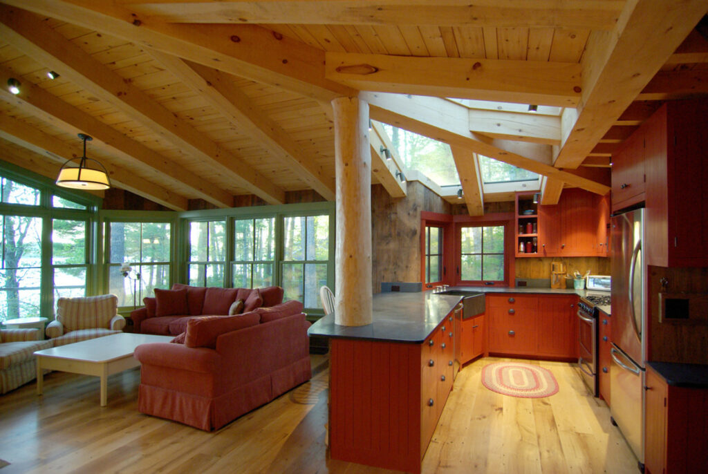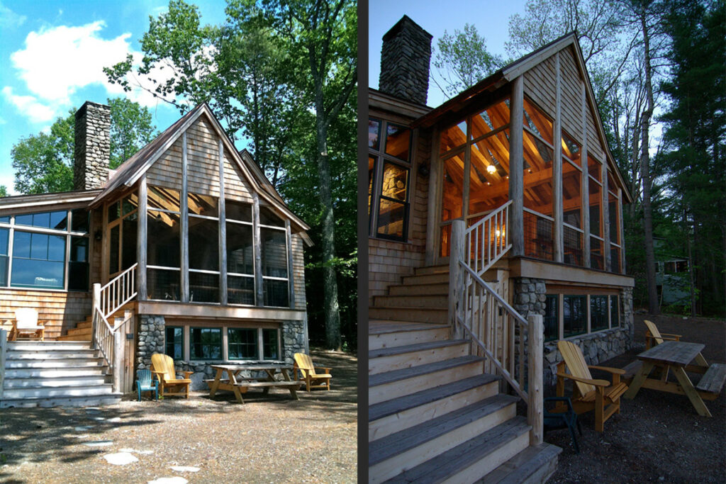 On the water side of the camp, a large screened porch was added which serves as an open courtyard to the other rooms of the house. To keep the screened porch from obscuring the daylight to the rest of the house, the southern roof plane was sheathed almost completely in oversized glass panels, flooding the porch and adjacent living areas in sunlight.