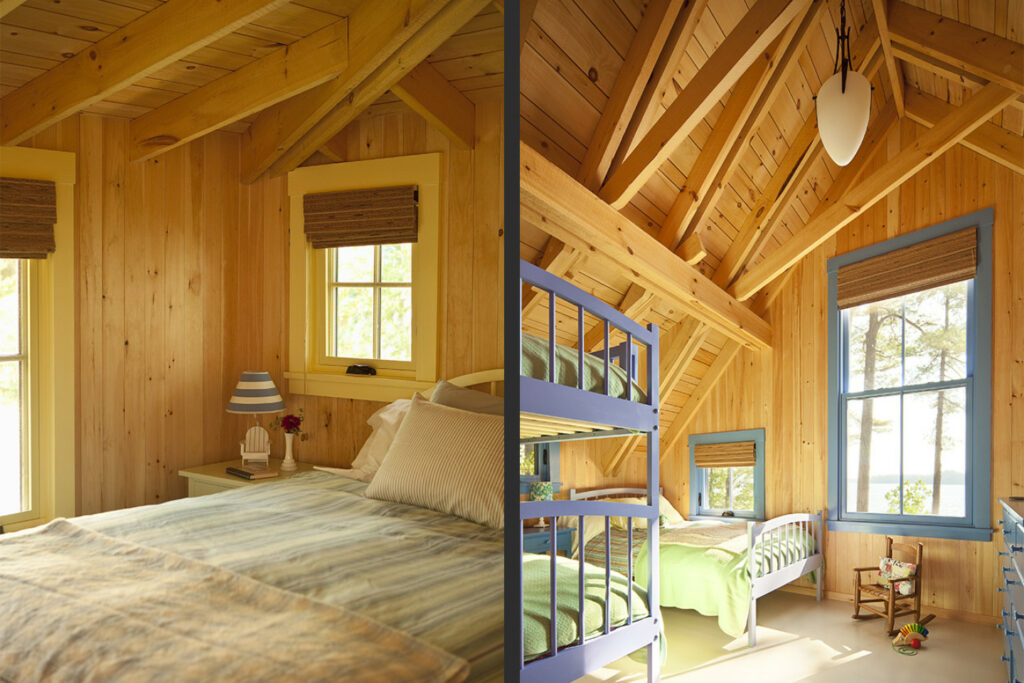 After much deliberation, the decision was made to remove the existing camp and rebuild it in its place. Due to the small lot size and proximity of the existing camp to the water, the volume, square footage, and site coverage limits of the new structure would define the project. To make the most of the limited volume of the new building, many roof pitches were kept low and shallow, tethered to two taller, traditional gable forms. Inside, the structural roof beams and rafters were left exposed, to maximize headroom and the perception of openness in the rooms.