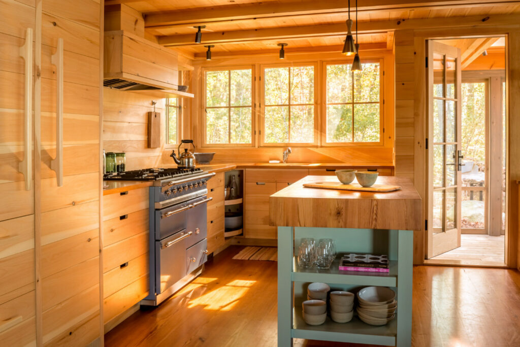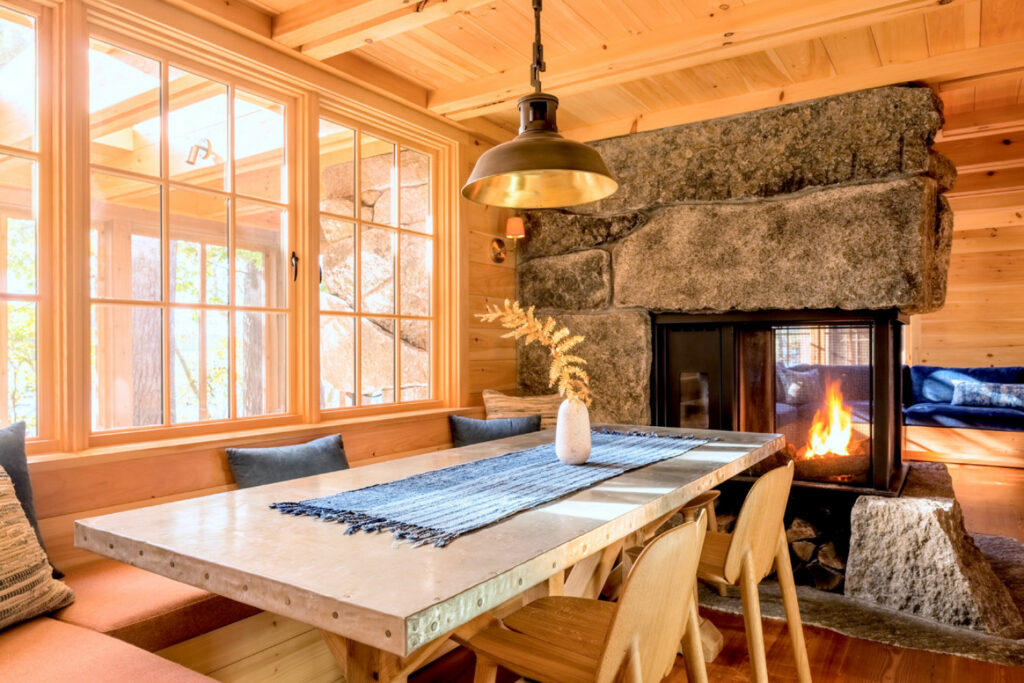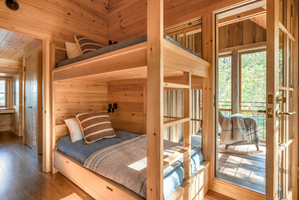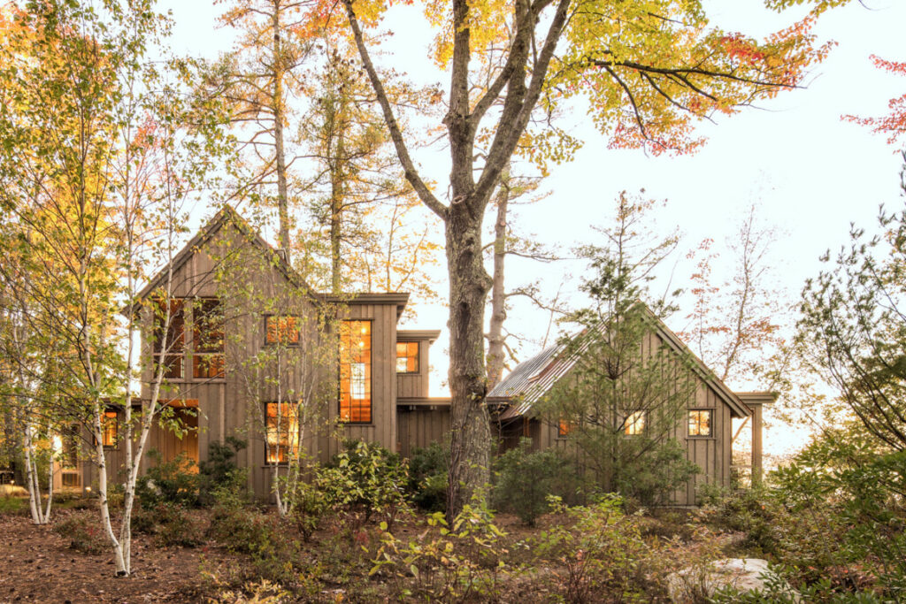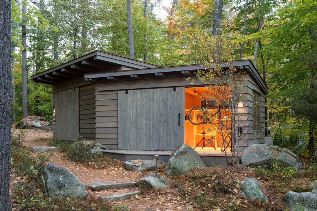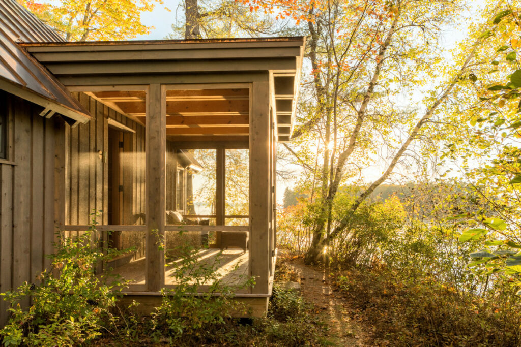 The muted color palette and natural materials on the exterior of the camp further blend the structure into the surrounding trees and landscape. Despite the proximity to the water, it can be hard to spot from passing boats.