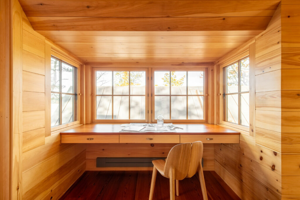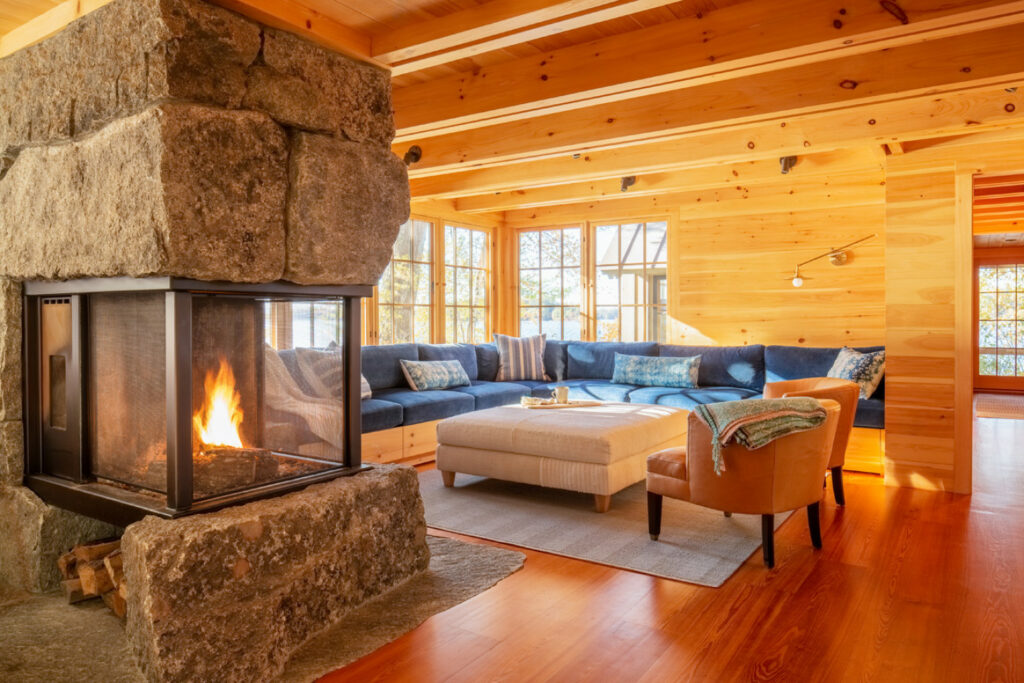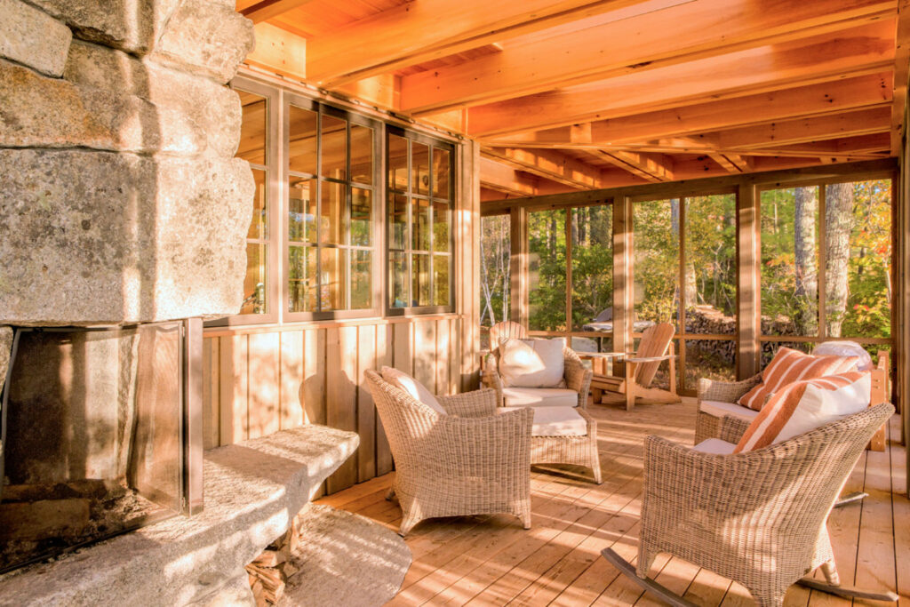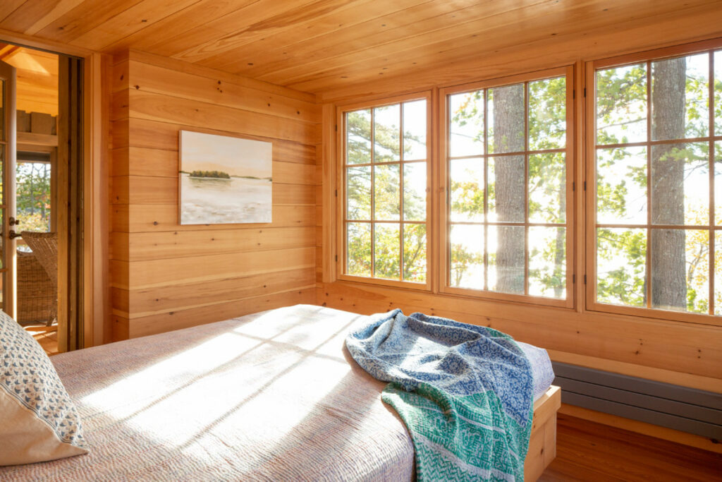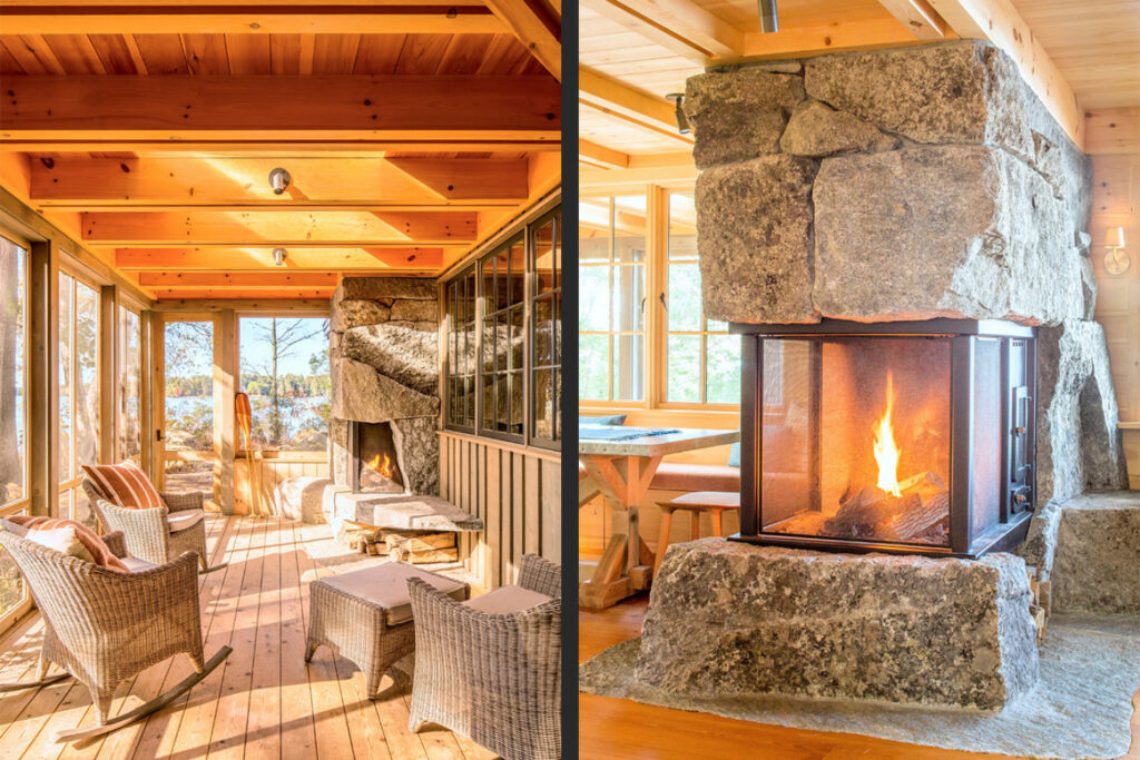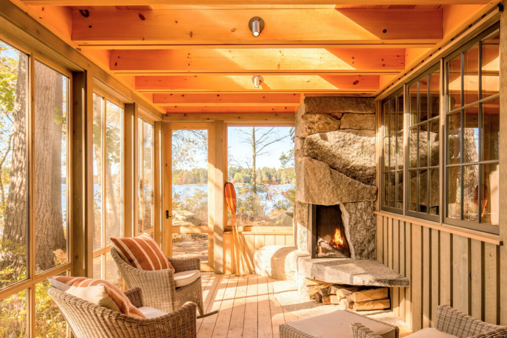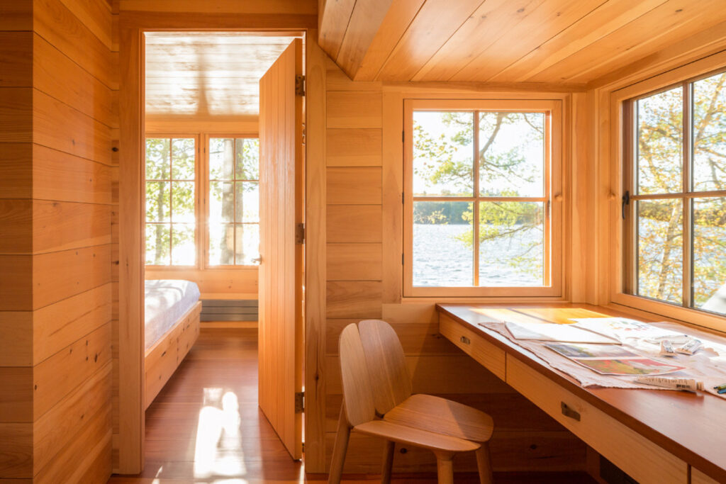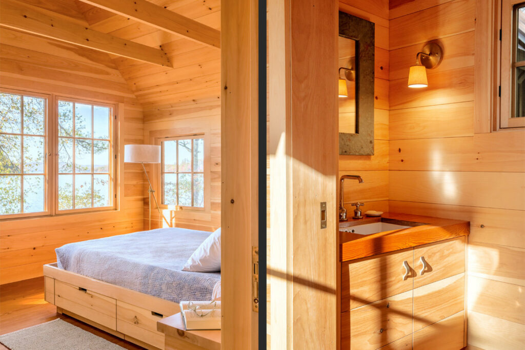 A comfortable living and dining area is warmed by a massive, bouldered, three-sided fireplace. This backs up to a screened porch that sits almost on the ground, only a few feet from the sound of the waves lapping on the lake. Up a central stairway lies a quiet guest bedroom and bunkroom that sleeps four more, plus a generous built-in desk lit with windows on three sides and views out to the lake beyond. Each bedroom in the small camp includes an attached porch for morning coffee and a quiet spot to read.