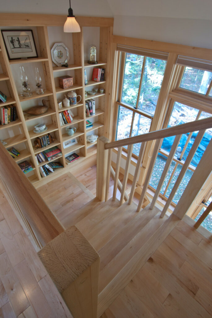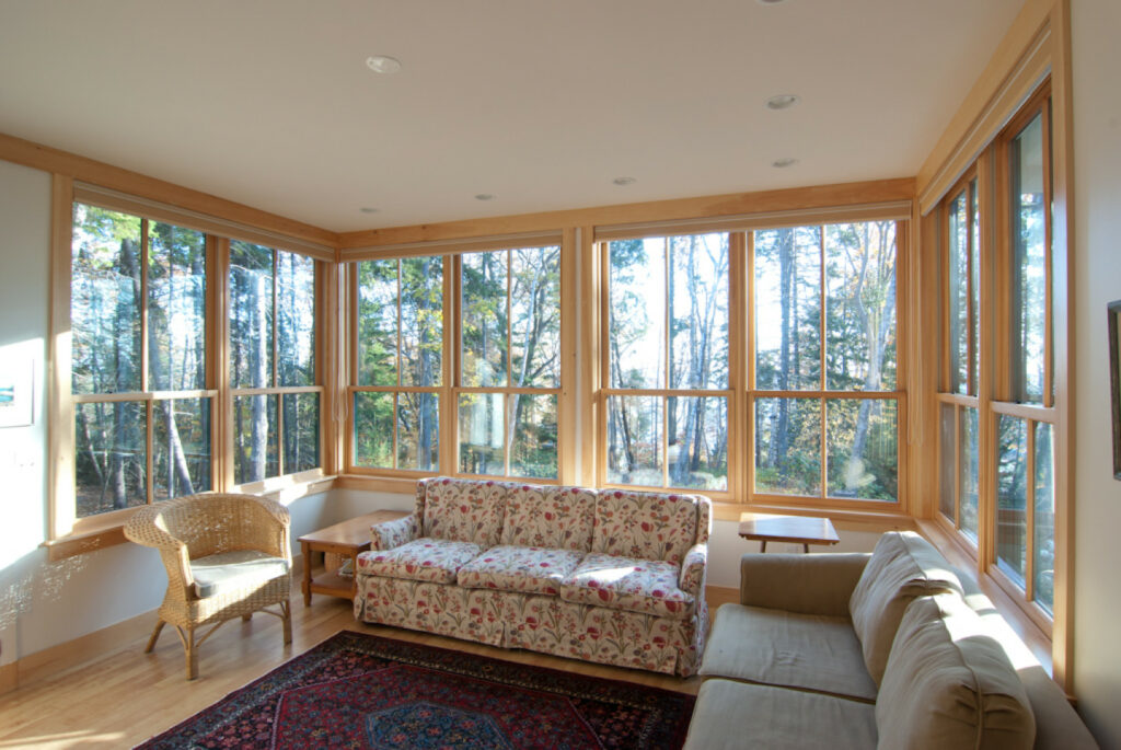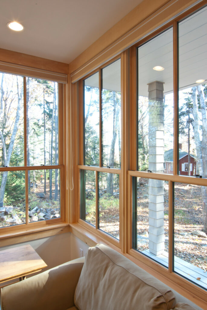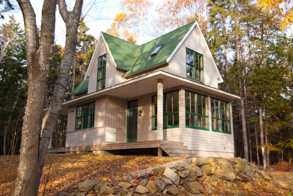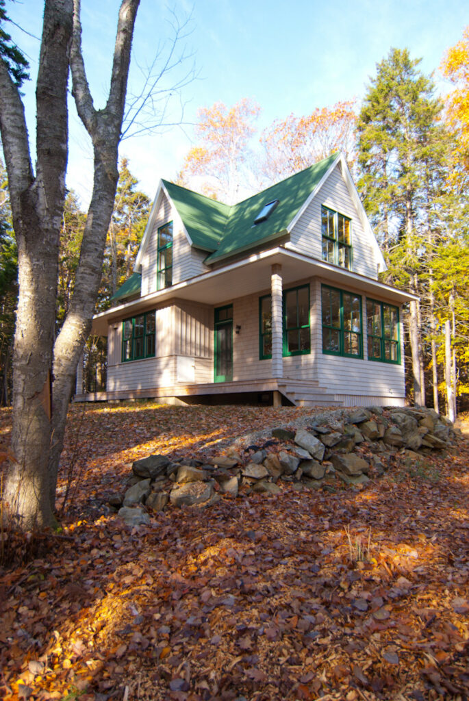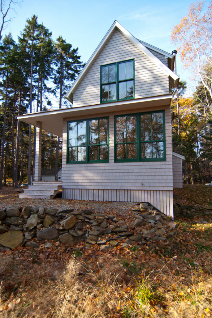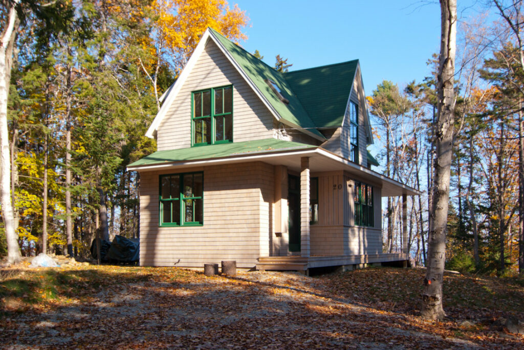 The finished cottage is a warm and inviting retreat, perfectly tucked into the island woods. The design emphasizes comfort and simplicity, creating a peaceful haven that allows the natural beauty of the surroundings to shine. The cottage offers a serene escape, harmonizing with the tranquil landscape.