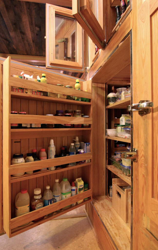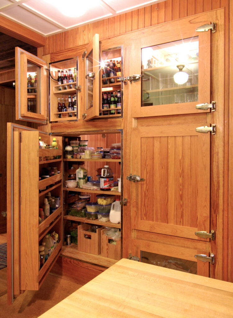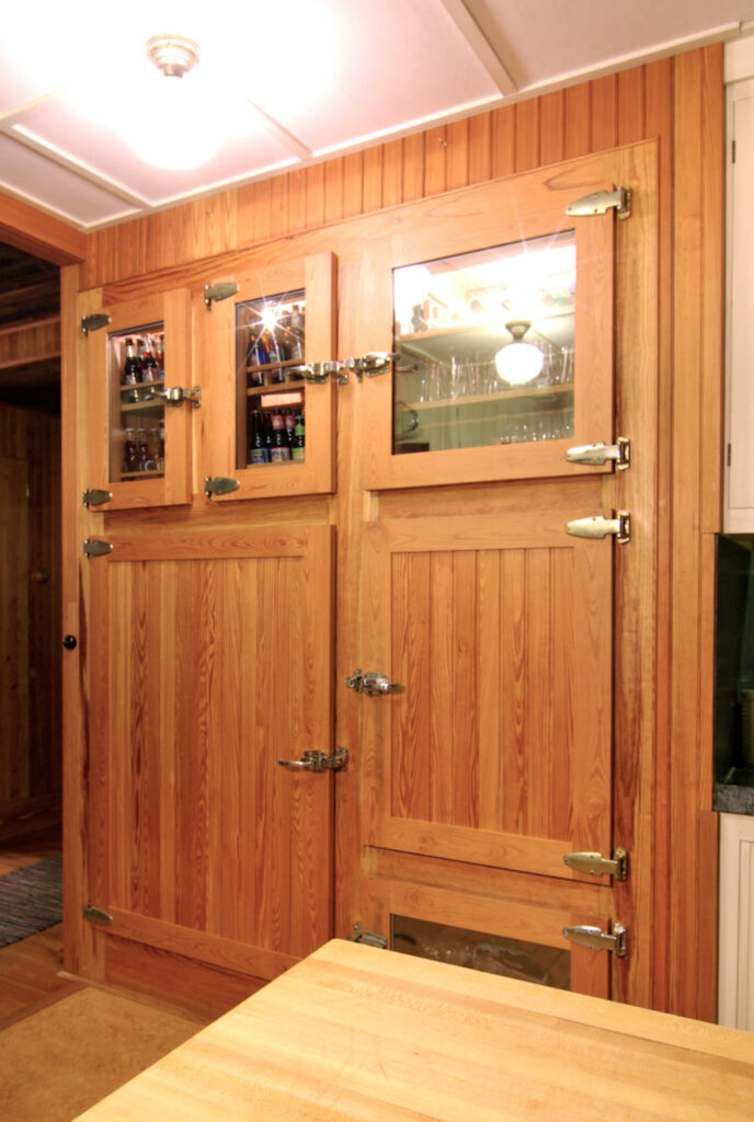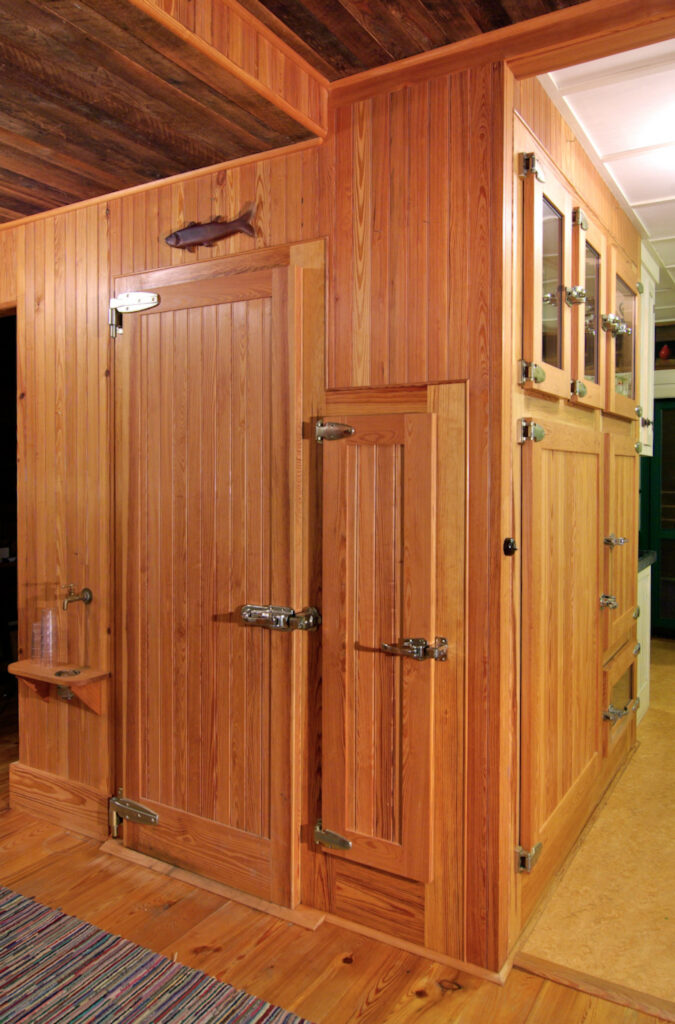 Client’s vision was for the classic walk-in wooden cooler (refrigerator/freezer): custom, all wood, The ‘kla-klunk’ sound made when ref doors close… was a descriptor for its ‘feel’. Walk-in to restock, outer access doors to the kitchen for convenience.