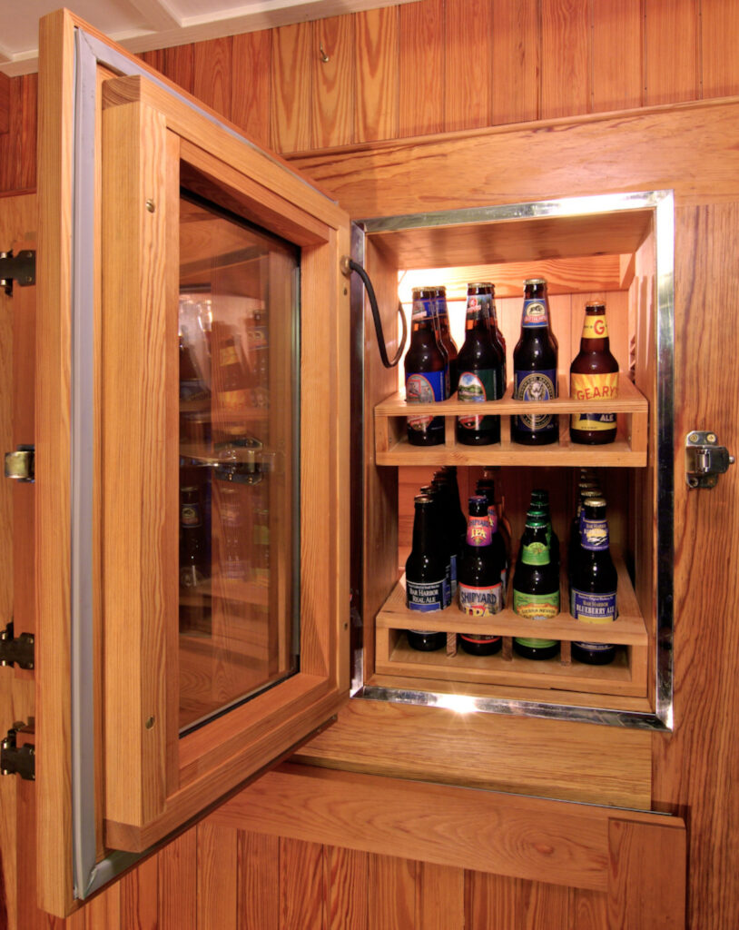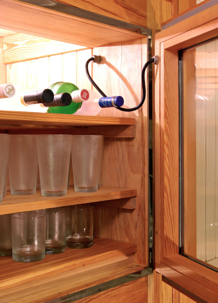 Traditional in appearance – but contemporary in performance: heated jambs (elim condensation, freezing), heated glass (elim condensation), access doors with embedded steel frame (skinned with wood) for endurance, stability, resawn recycled heart-pine inside and out, antiqued hardware (new), water cooled and remotely located condensers for quiet operation, chilled bottled water spigot, special ‘super-chilled’ compartment loads from interior with soda and beer.